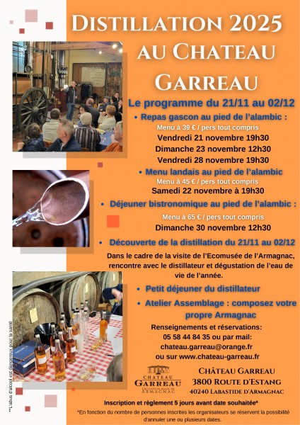 - Déjeuner et dîner au pied de l’alambic : directement dans la distillerie au pied de l’alambic en fonctionnement, repas du terroir (apéritif, pâté gascon, garbure maison à volonté et tourtière à l’Armagnac) et dégustation de l’eau de vie de l’année, vin et armagnacs compris. Explications par le distillateur.