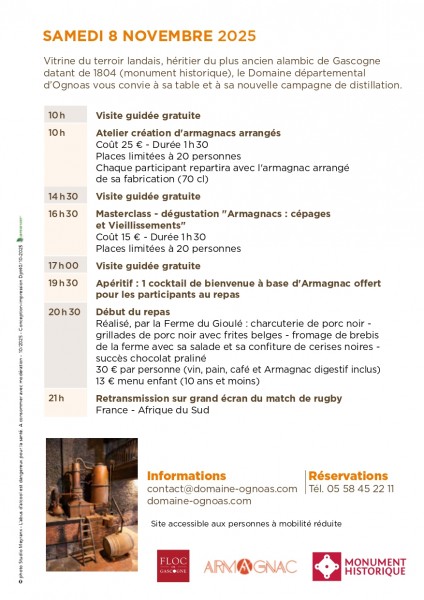 Réservations par email (contact@armagnac-ravignan.com) : indiquer le nom, le numéro de téléphone, l'adresse mail de chaque participant à la soirée ou à la rencontre du dimanche.