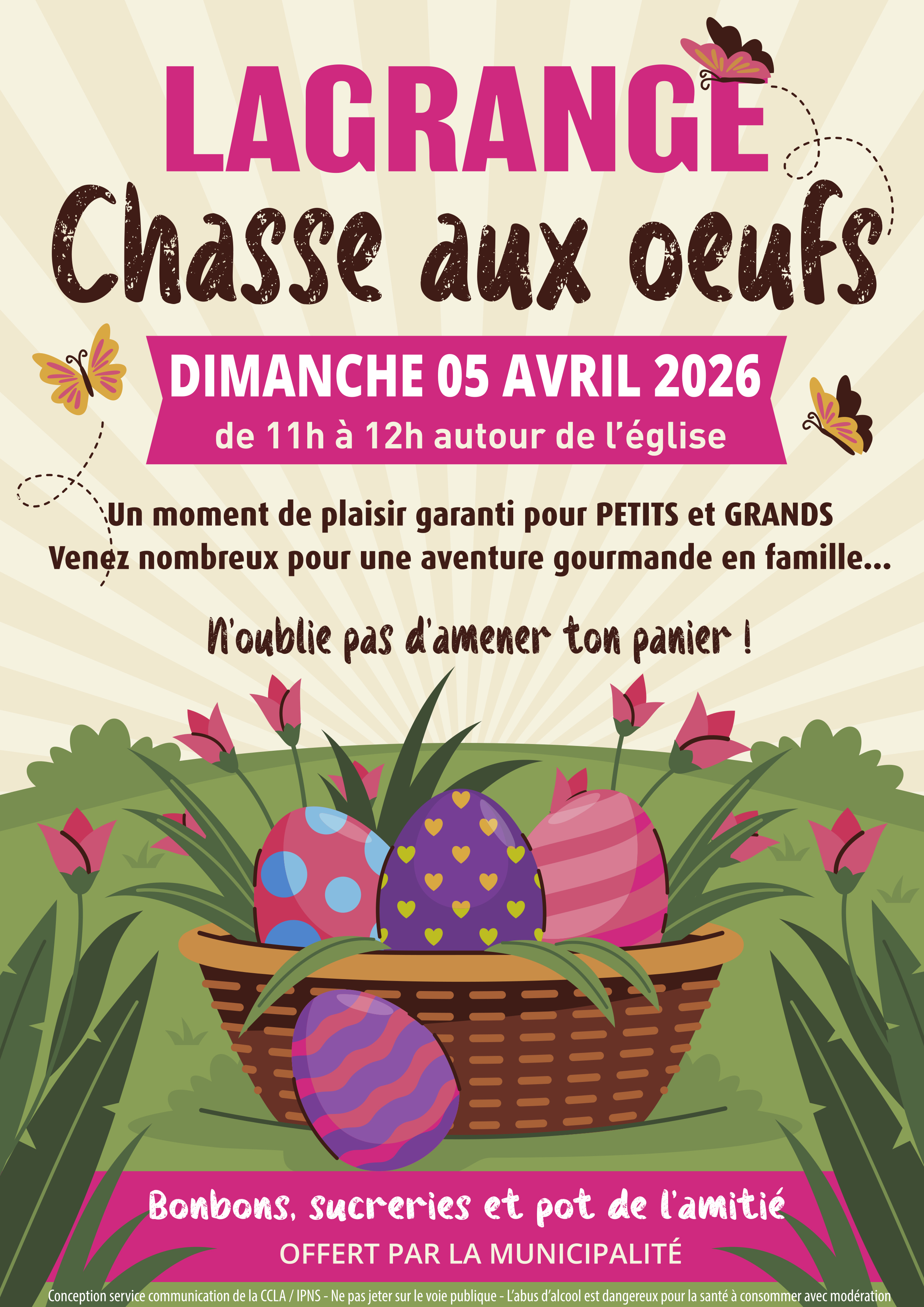 Les cloches viennent de passer et ont laissé quelques gourmandises chocolatées bien cachées pour les enfants ! Alors pour vivre une aventure gourmande en famille, on ramène son panier et on cherche le moindre indice pour pouvoir se régaler ! En fin de matinée, un verre de l'amitié sera offert par la municipalité.