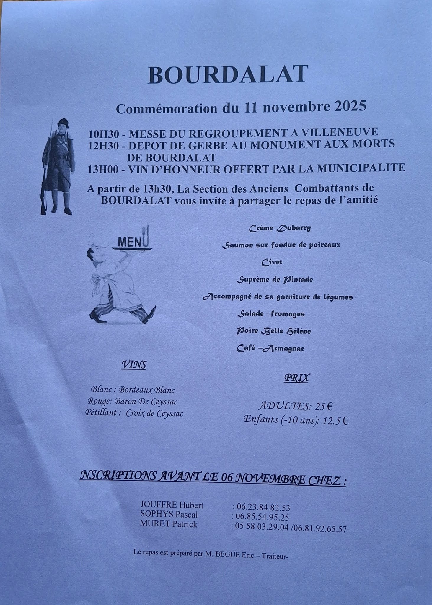 La commune de Bourdalat vous invite à venir partager un moment de mémoire et de convivialité à l’occasion de la commémoration de l’Armistice du 11 Novembre.