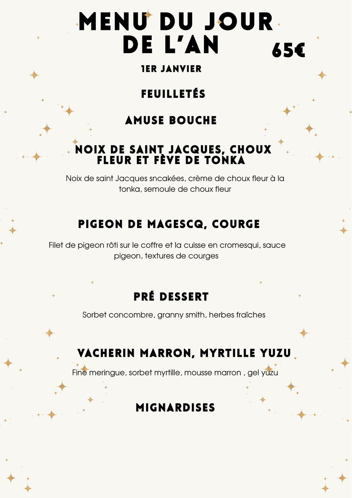Les chefs Antoine Latry et Coralie Gauvrit et leurs équipes vous accueillent le 1er janvier pour vous concocter un menu spécial pour le jour de l'an.